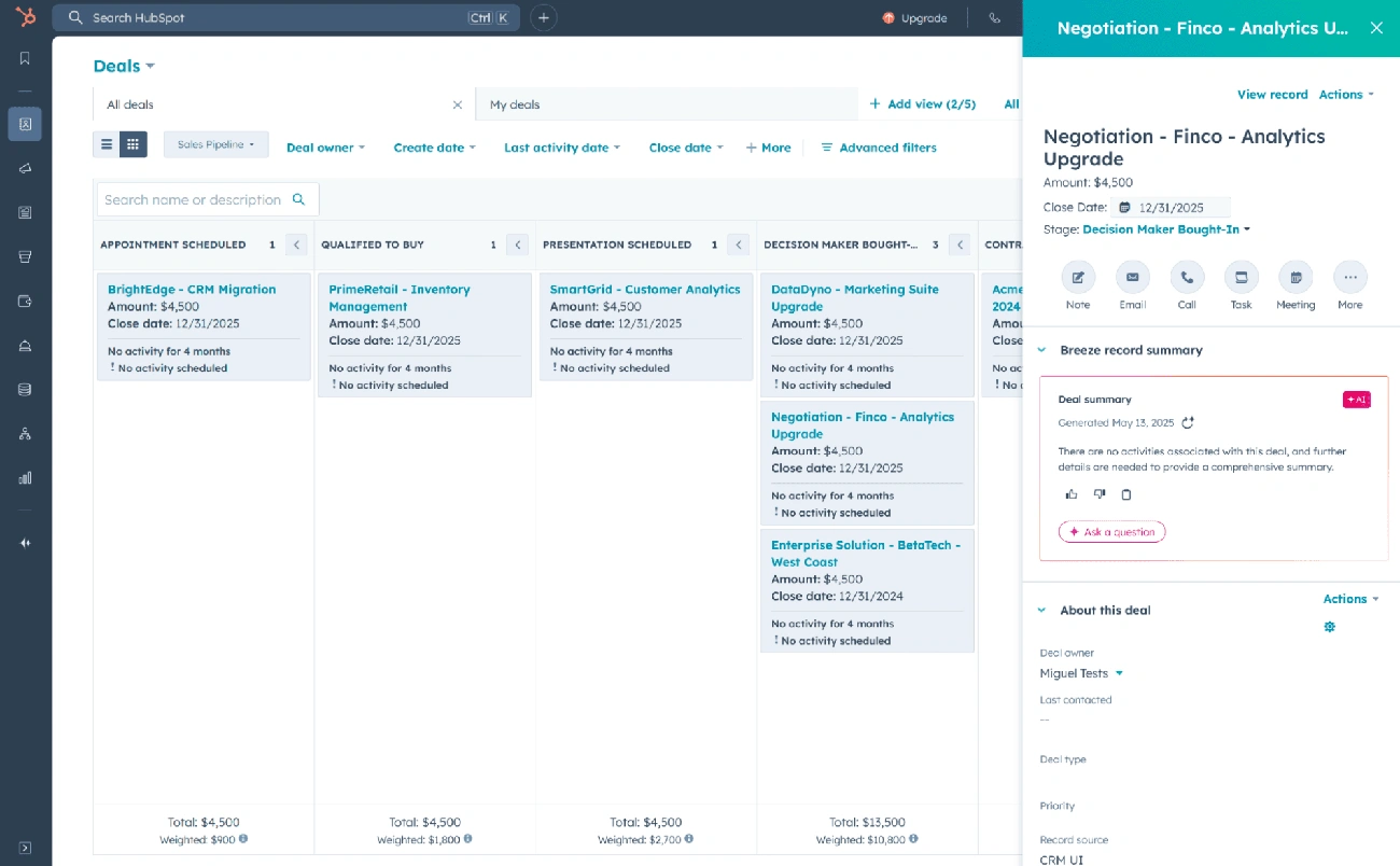 HubSpot provides AI-powered tools called "Breeze" that work across marketing, sales, and service functions. These tools include AI agents that automate workflows from start to finish.